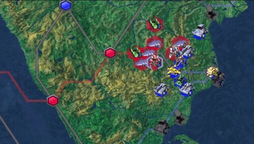 さて・・・マドラス攻略戦の続きです。あの位置にビッグトレーが居るのが厳しいな。 既に一度、ヒルドルブ隊がビッグトレーの射程圏内にうかつに入った為にドレンが瀕死となっているのだ。くそう、まさかビッグトレーに苦戦する日が来ようとは・・。 えぇい…